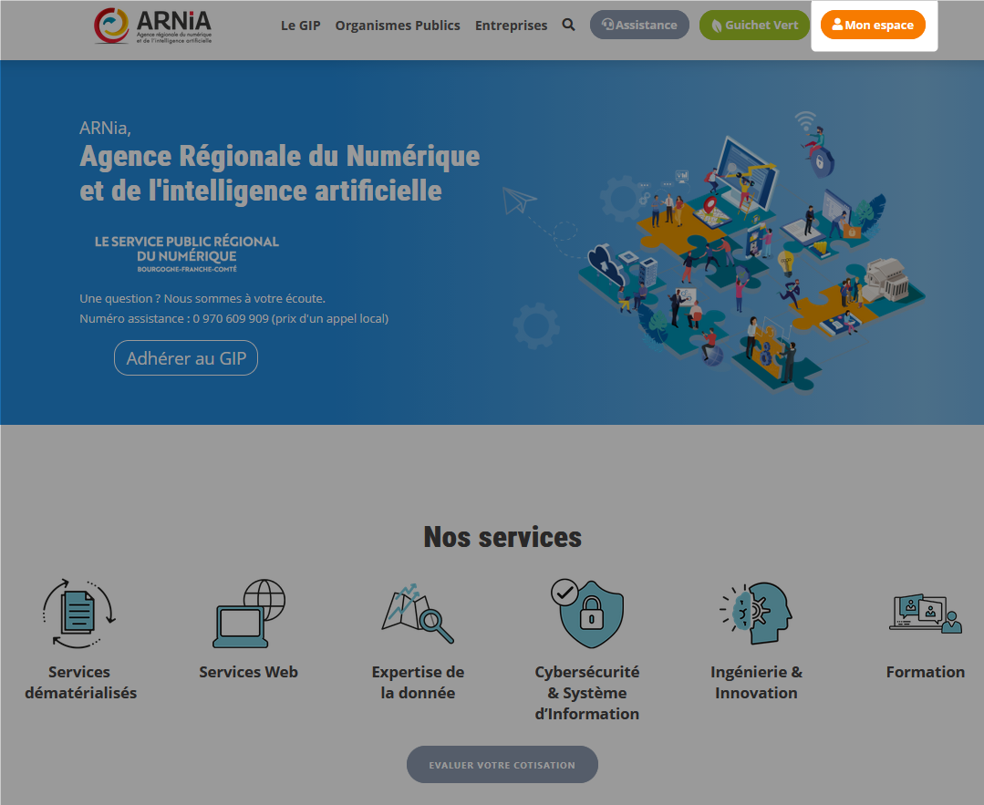Accédez à votre espace depuis le site https://arnia-bfc.fr/mon-espace ou https://arnia-bfc.fr et connectez-vous avec votre identifiant et mot de passe (bouton en haut à droite de la fenêtre).