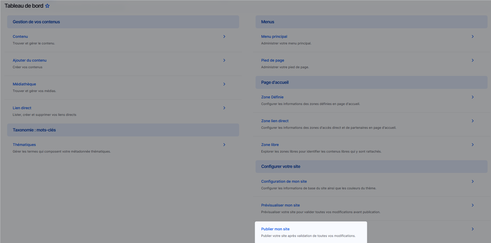 Que ce soit votre première publication ou non, à chaque modification ou création de contenu, vous pouvez prévisualiser vos corrections et ajouts (la prévisualisation reste une vue en interne), puis publier à nouveau votre site pour mettre en ligne les modifications validées. Pour plus de détails, vous pouvez suivre ce lien : J'ai publié mon site... Et après ?