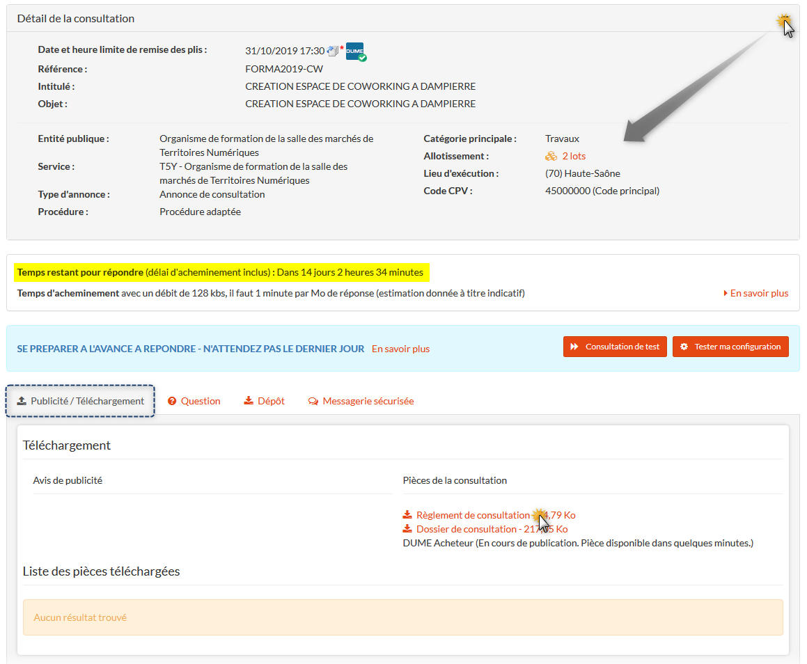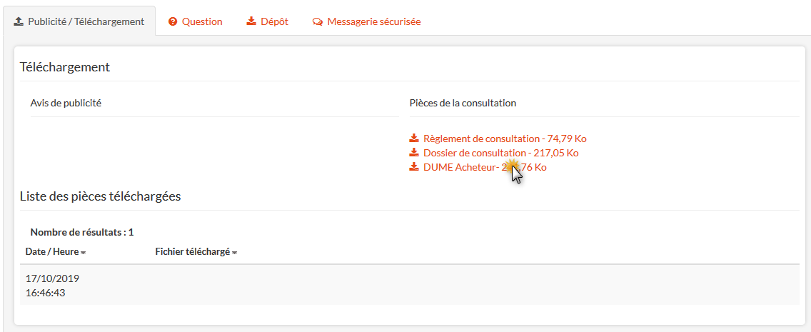 De retour au niveau du détail de la consultation, vous pouvez aussi télécharger le DUME de l'acheteur pour cette consultation :