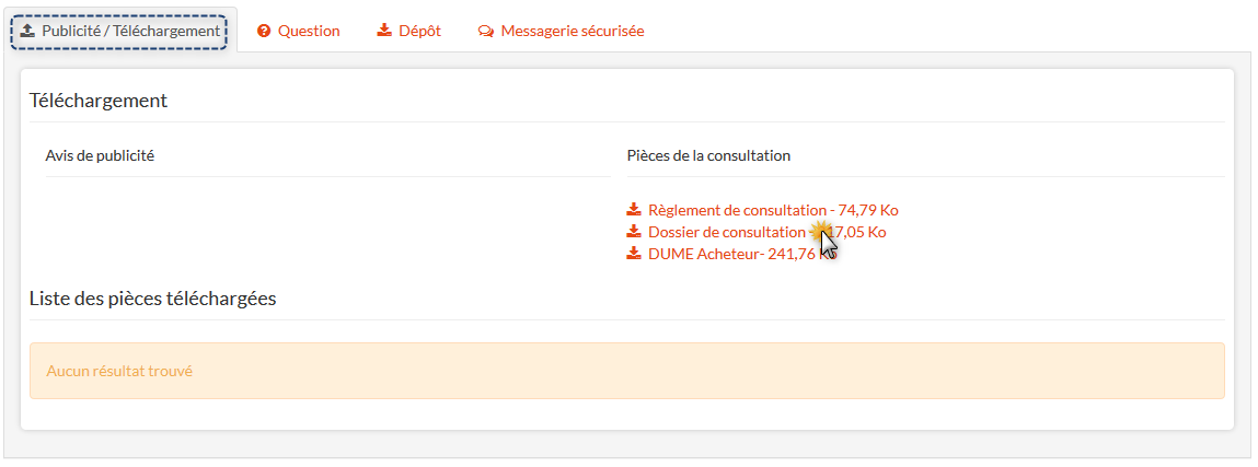 Toujours au niveau du pavé inférieur, dans l'onglet Publicité/Téléchargement, téléchargez le Dossier de consultation :