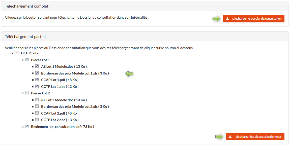 Après validation, si l'acheteur l'a autorisé, vous pouvez télécharger soit l'intégralité du DCE soit uniquement les éléments qui vous intéressent :