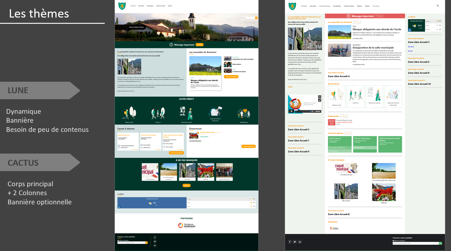 Cmonsite propose 5 thèmes à disposition. Il s'agit de modèles de sites proposant une mise en page spécifique pour chacun d'entre eux. Ces thèmes peuvent être utilisés dans leurs caractéristiques par défaut ou complètement personnalisés.
