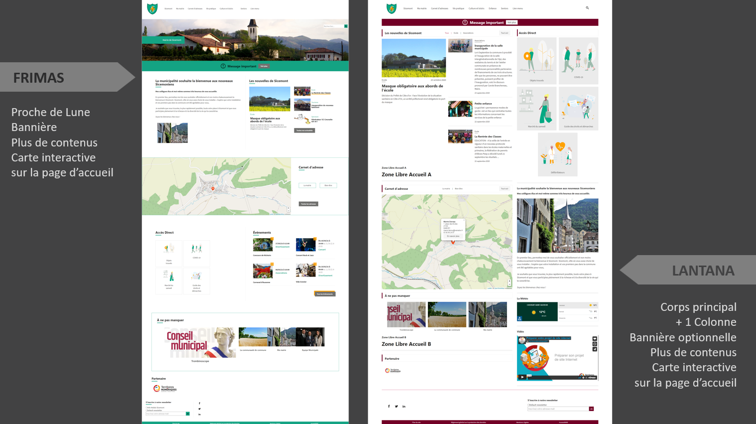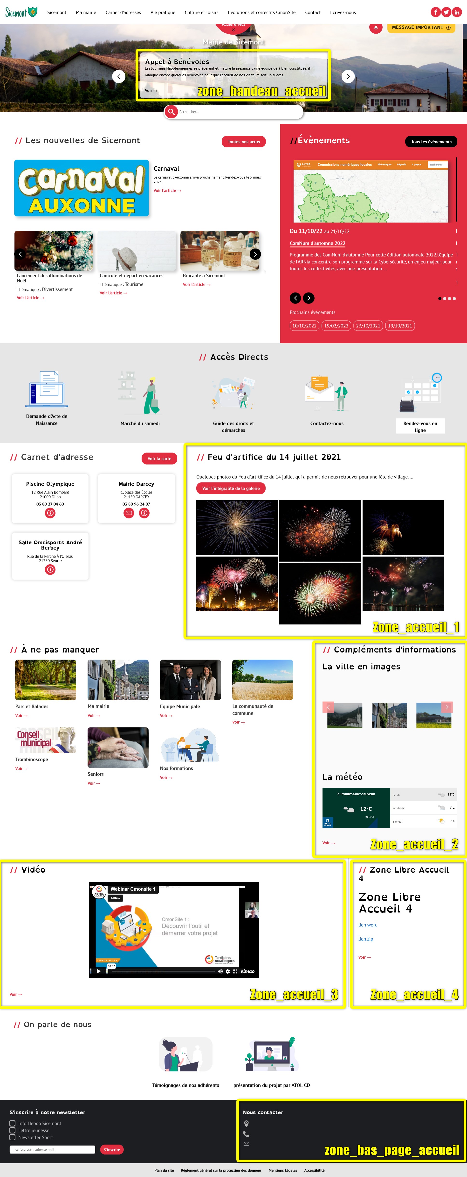 Zone_bas_page_accueil : sur la droite dans le bandeau en pied de page. Par défaut elle reprend les informations de contact de la collectivité renseignées dans la configuration du site, dans les mentions légales. Vous pouvez créer une zone libre qui remplacera les informations de contact