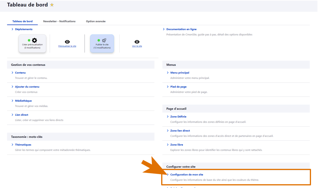Le choix du thème et sa personnalisation selon l'exemple ci-dessus pourront se réaliser dans la rubrique Configuration de mon site puis Paramètres du thème :
