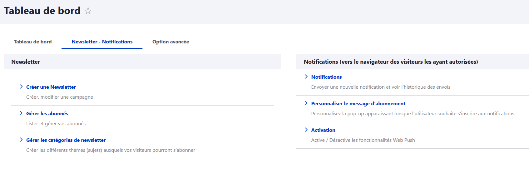 Dans le Tableau de bord, vous retrouvez un onglet "Newsletter - Notifications"
