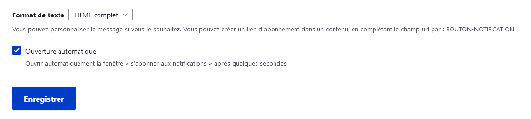 Vous pouvez, si vous le souhaitez ajouter le bouton "cloche" manuellement dans un contenu libre sur votre page d'accueil (ou dans le message de notifications qui apparait dans une fenêtre contextuelle) pour inviter vos usagers à accepter les notifications. Pour cela, créer un lien vers l'url : BOUTON-NOTIFICATION qui sera automatiquement converti en bouton "cloche".