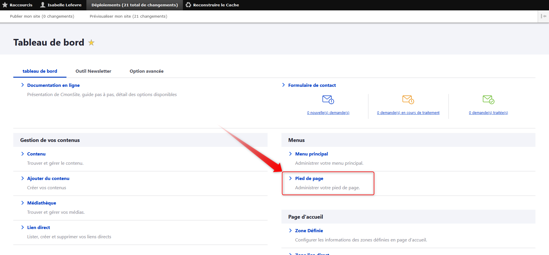 Sur votre tableau de bord, cliquez sur "Pied de page" dans la rubrique "Menus".