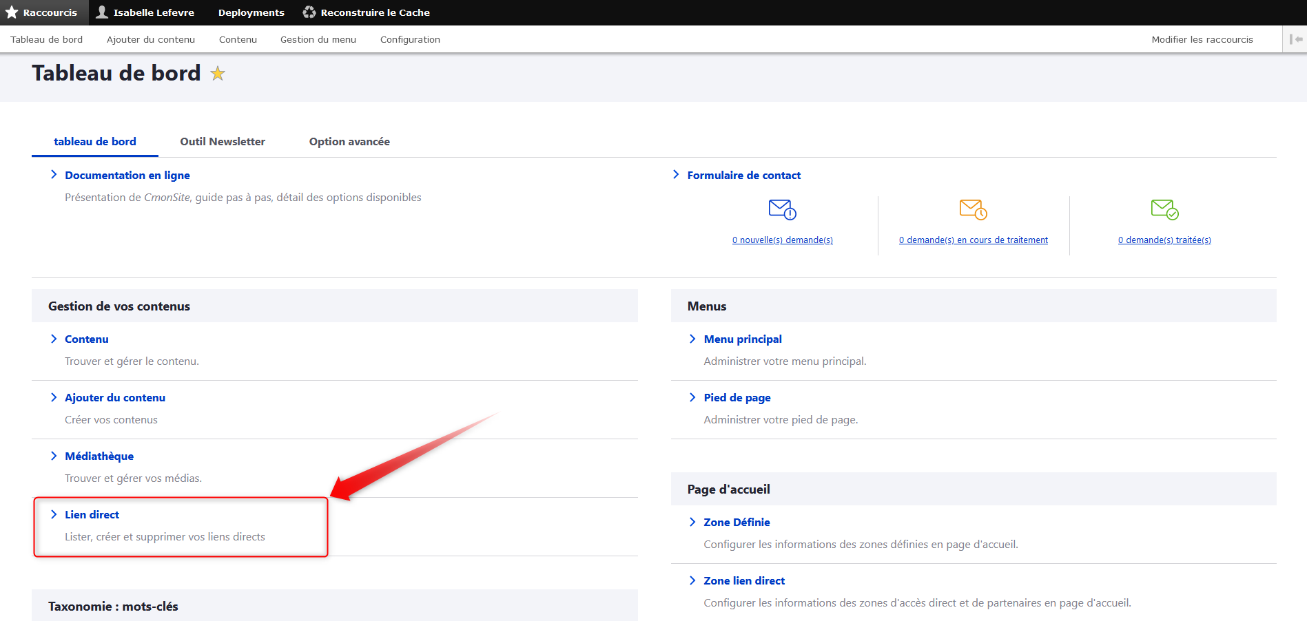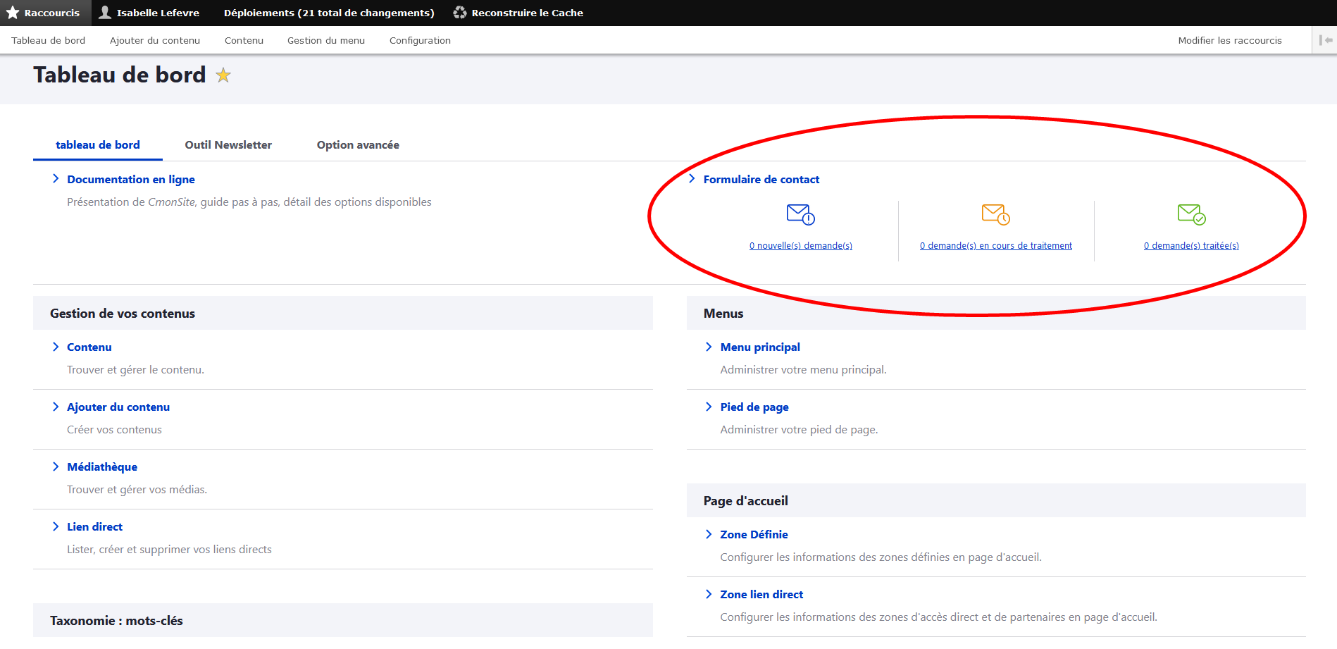 En retournant au tableau de bord, une nouvelle rubrique sera affichée, en haut à droite :