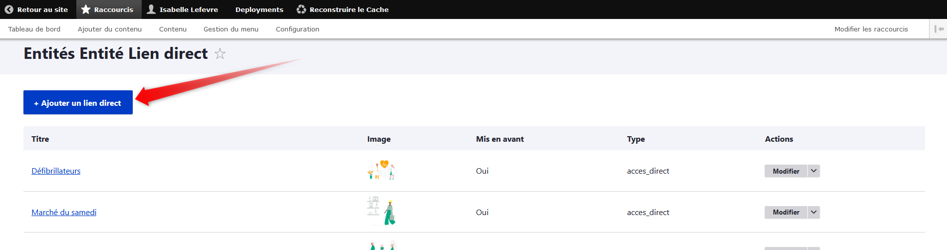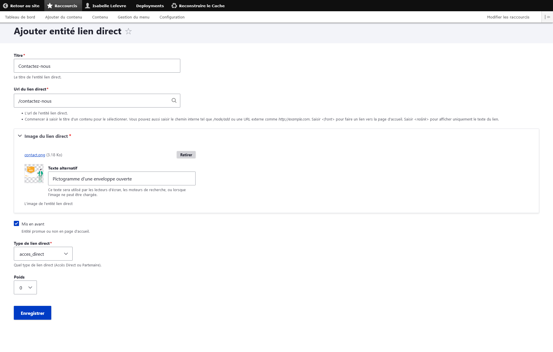 Cochez la case "Mis en avant" puis choisissez "acces_direct" dans le type de lien direct. Vous pouvez choisir un poids, cela jouera sur l'emplacement de l'accès direct dans la rubrique de la page d'accueil. Si le poids est grand (+20), l'accès direct sera le premier à gauche de vos accès directs. Enfin, cliquez sur "Enregistrer".