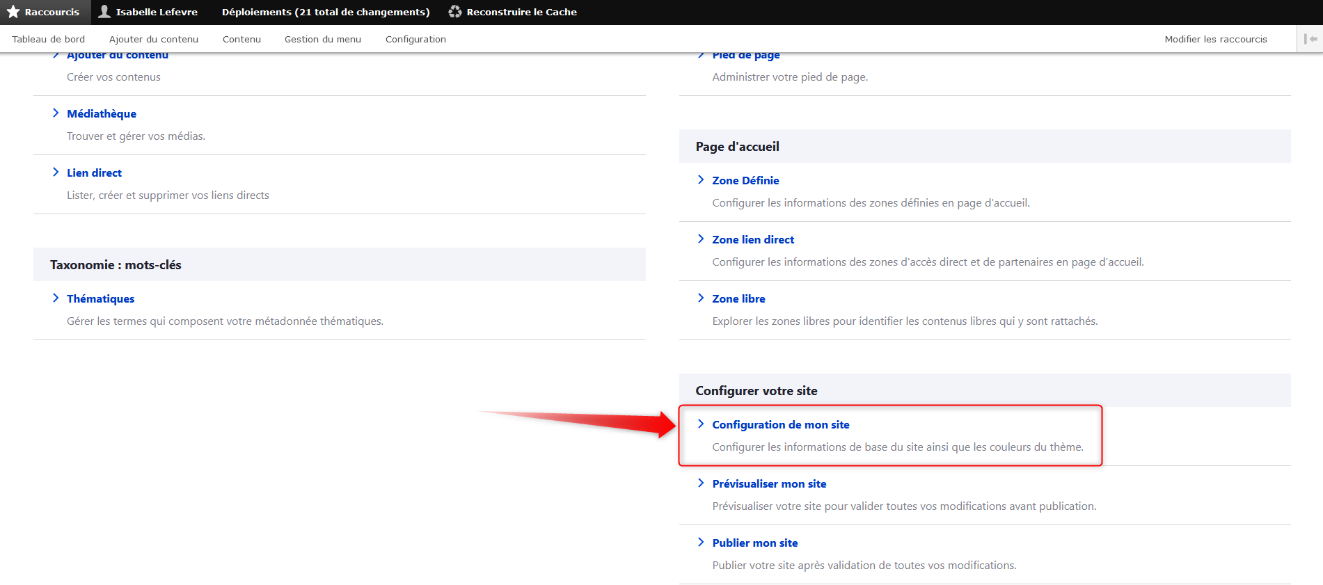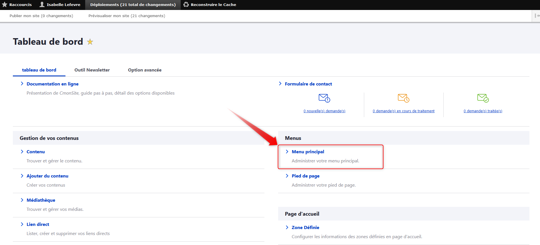 Sur votre tableau de bord, cliquez sur "Menu principal" dans la rubrique "Menus".