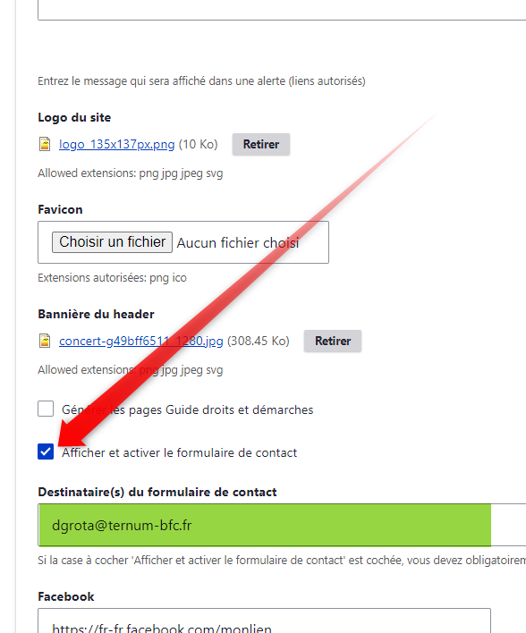 Puis, dans l'onglet "Paramètres du site" sur lequel vous vous trouvez, cochez la case "Afficher et activer le formulaire de contact", juste en dessous des images de logo et bannière. Si vous le souhaitez, vous pouvez entrer une ou plusieurs mails qui recevront une notification à chaque nouvelle demande créée via le formulaire de contact en ligne sur votre site. Cliquez ensuite sur "Enregistrer la configuration" tout en bas de la page.