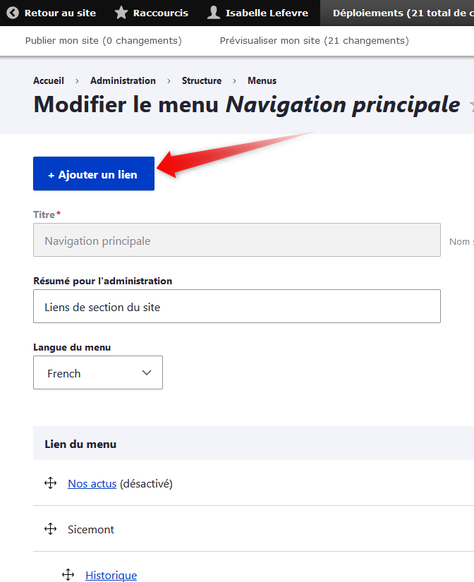 Le principe est ensuite le même que pour le menu principal : cliquez sur "Ajouter un lien"