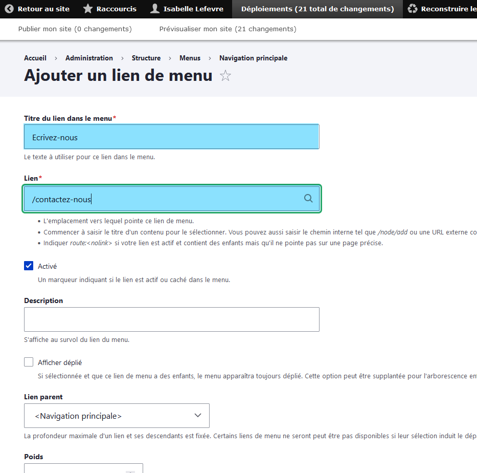 Complétez le champ "Titre du lien dans le menu" (ici : Contactez-nous) puis le champ "Lien" par : /contactez-nous