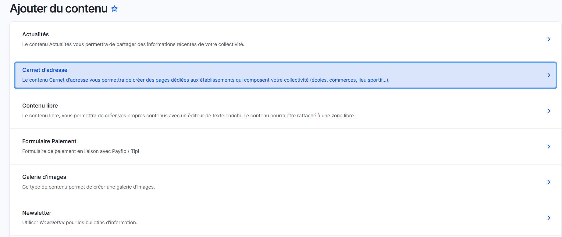 Pour créer un contenu à ajouter à votre site, rendez-vous sur l'onglet "Ajouter du contenu" du tableau de bord. Cliquez ensuite sur l'onglet "Carnet d'adresse" pour accéder à la page de création de carnets d'adresses.