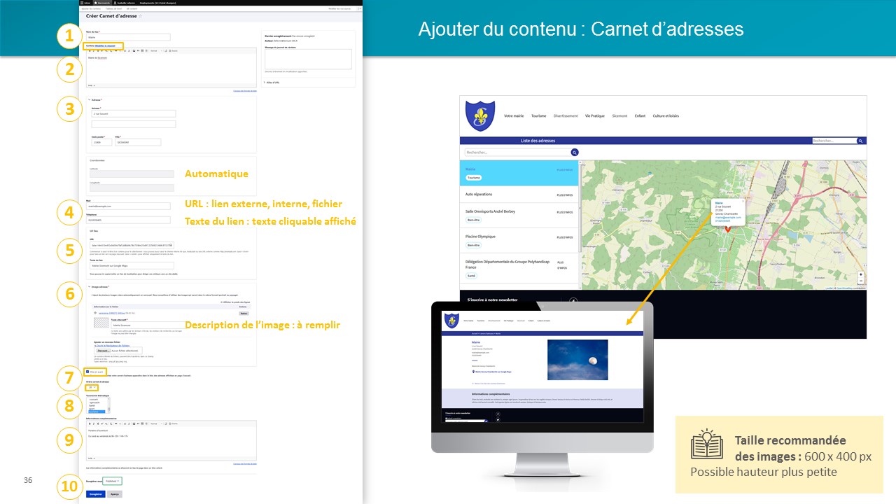 - Insérer le contenu de votre carnet d'adresse (texte, image, fichier PDF...), ce contenu sera affiché lorsqu'un utilisateur cliquera sur le carnet d'adresse (2)