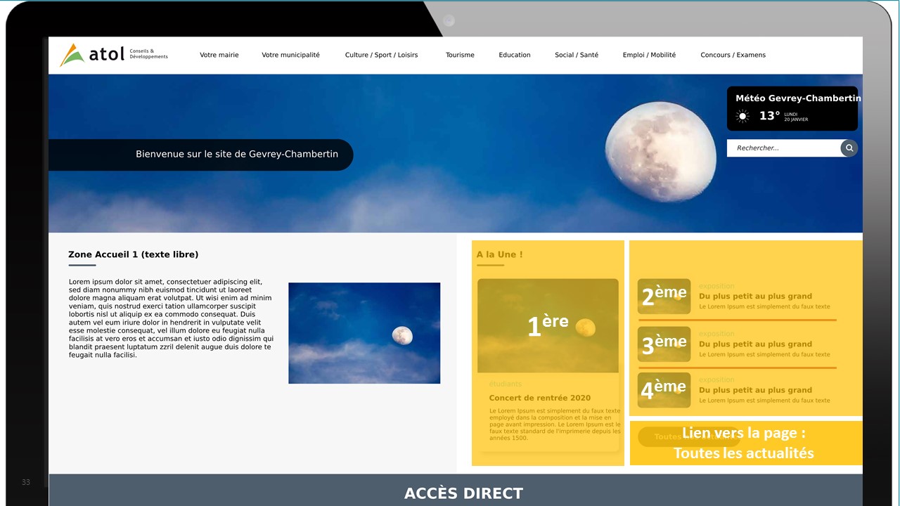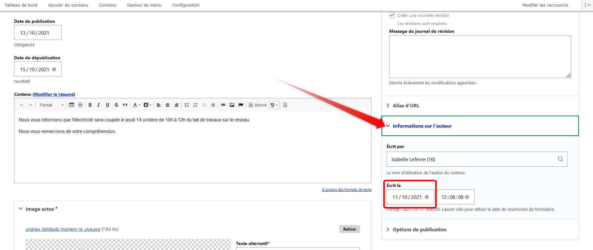 Vous pouvez jouer sur la date de création de votre actualité pour la faire apparaître en premier sur votre page d'accueil.
