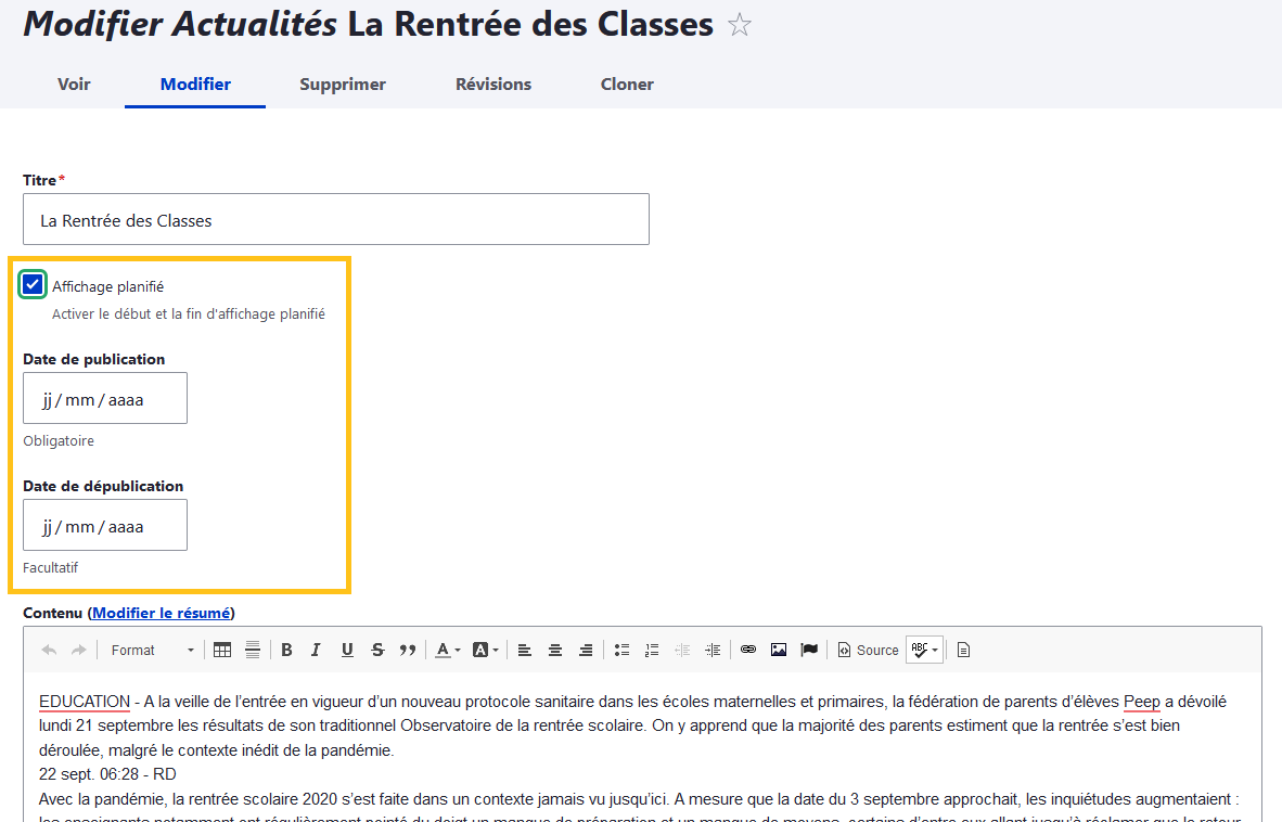 Il est également possible de choisir une date de début et de fin de publication en cochant la case "Affichage planifié".