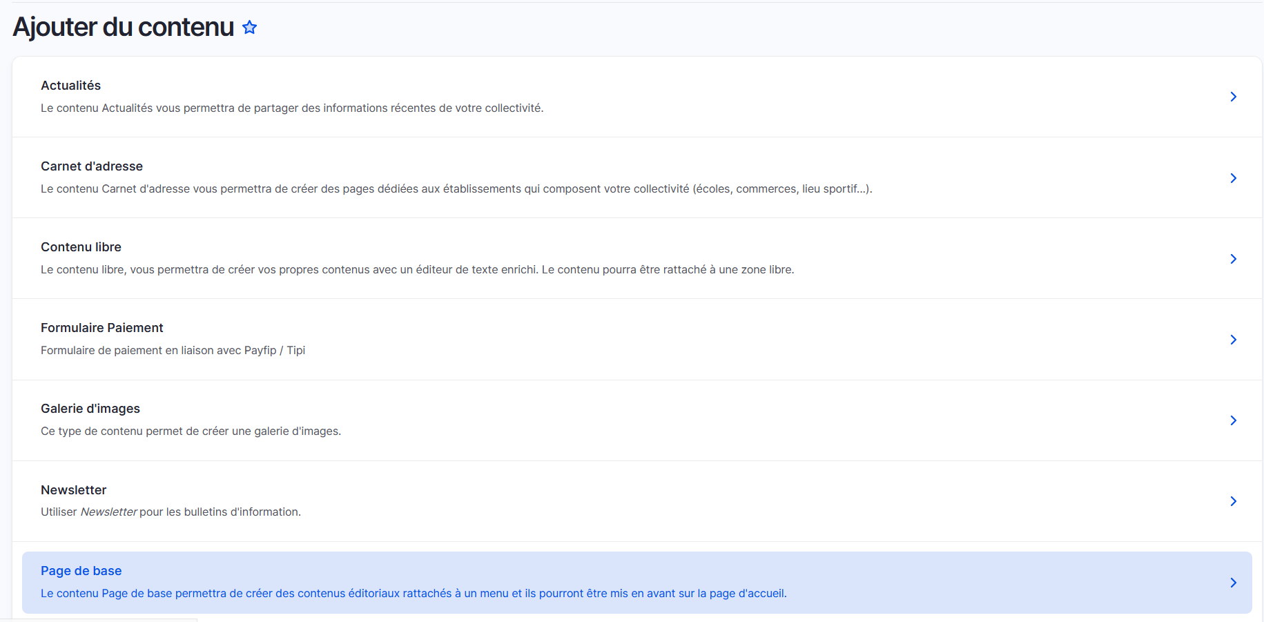 Pour créer un contenu à ajouter votre site, rendez-vous sur l'onglet "Ajouter du contenu" du tableau de bord. Cliquez ensuite sur l'onglet "Page de base" pour accéder à la création de pages de base.