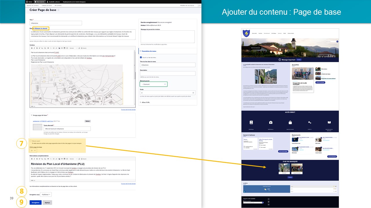 - Cocher la case "Mise en avant" permet de créer un lien vers la page sur la page d'accueil dans la partie "À ne pas manquer" (7)