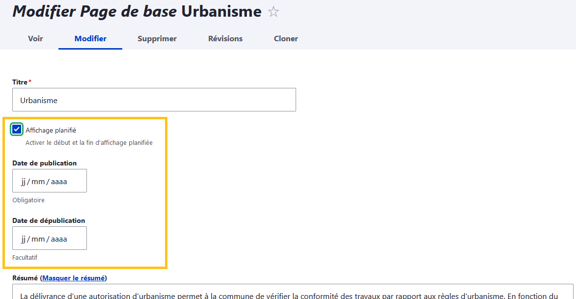 Il est également possible de choisir une date de début et de fin de publication en cochant la case "Affichage planifié".