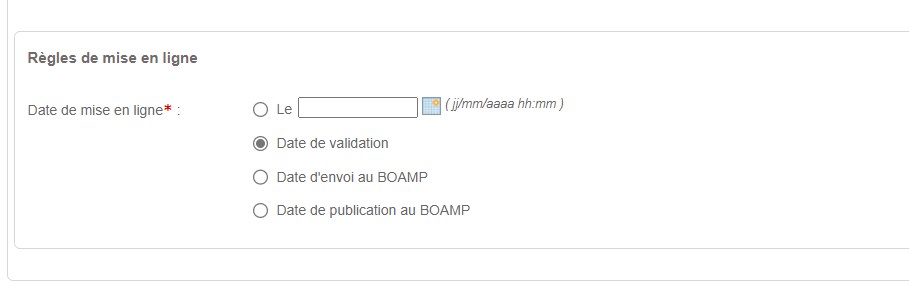 Elle peut avoir lieu soit, dès la validation finale de la consultation, soit à une date ultérieure à la validation (à indiquer dans cet onglet), soit à la date d'envoi au BOAMP ou enfin, à la date de publication au BOAMP.