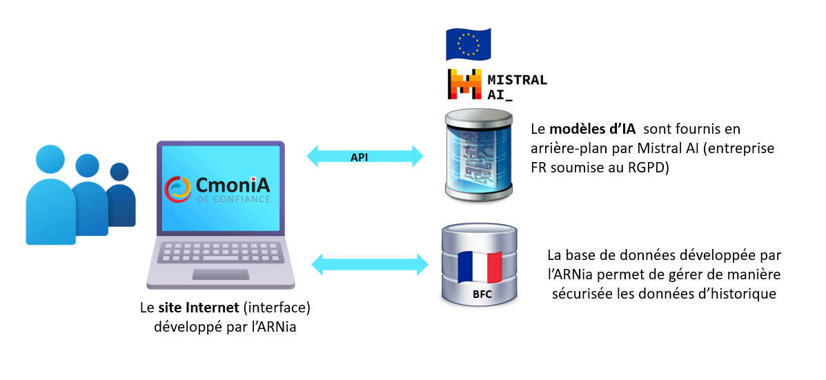 CmonIA utilise les modèles de l'entreprise française Mistral AI. Ces modèles sont hébergés en Europe et CmonIA y accède via leur API.
