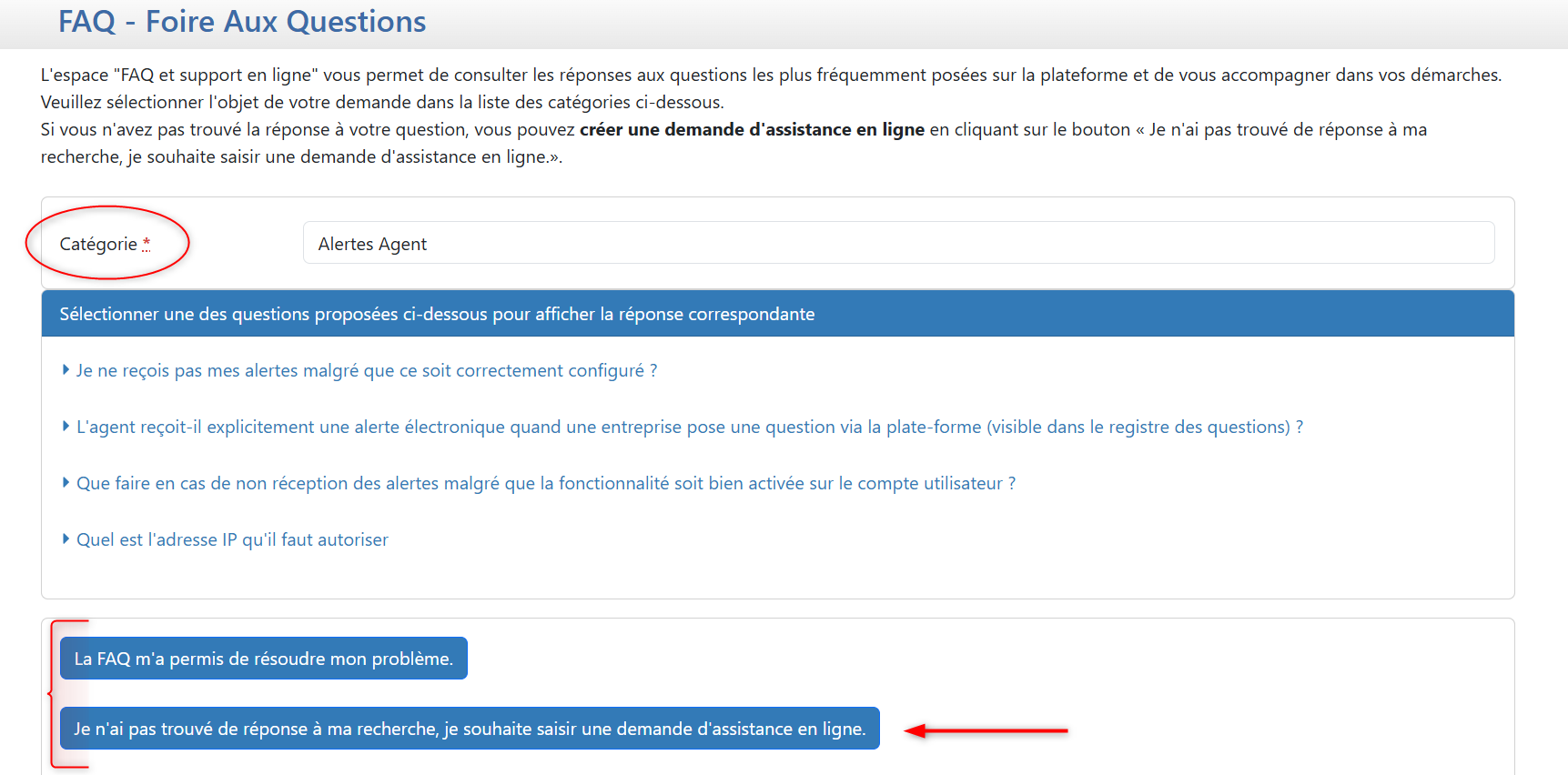 Si aucune des question ne correspond à votre demande, cliquez sur le bouton " je n'ai pas trouvé de réponse à ma recherche, je souhaite avoir une demande d'assistance en ligne" afin de définir plus précisément votre problème.