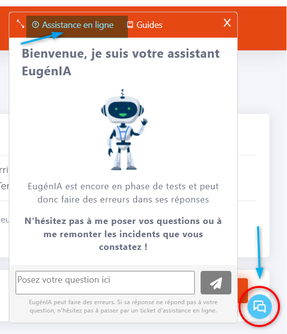 Saisissez directement votre question afin qu'Eugenia votre assistante IA puisse vous répondre, ou alors cliquez sur "assistance en ligne".