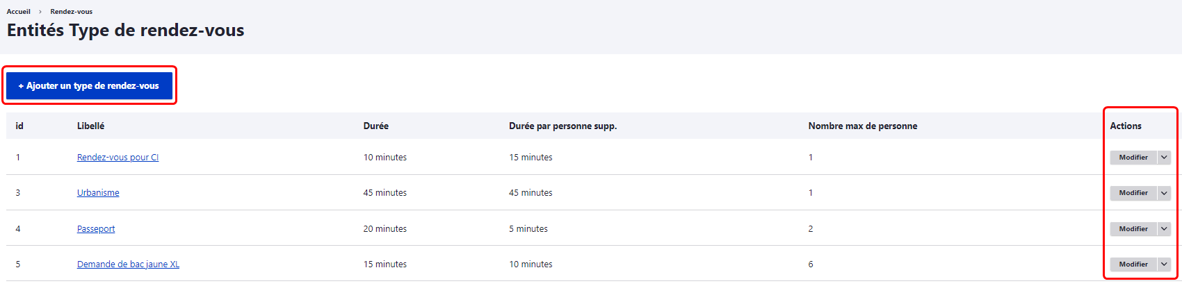 - Pour modifier ou supprimer un type de rendez-vous, cliquez sur celui-ci ou sur "modifier".