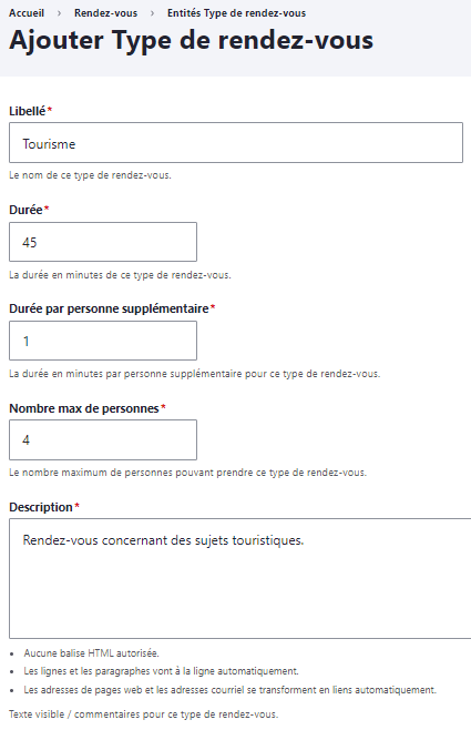 Après avoir cliqué sur "Ajouter un type de rendez-vous", vous renseignez les informations demandées dans le formulaire.