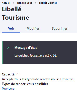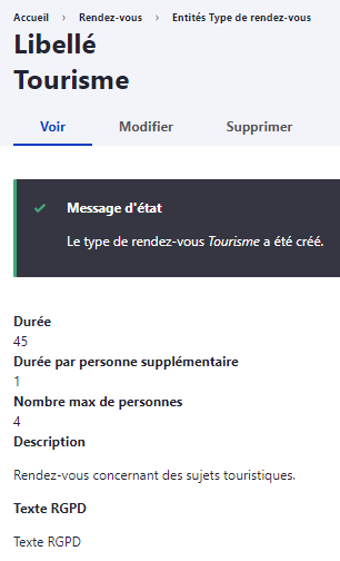 Un message d'état récapitulant les informations que vous venez de renseigner pour créer le type de rendez-vous s'affiche.