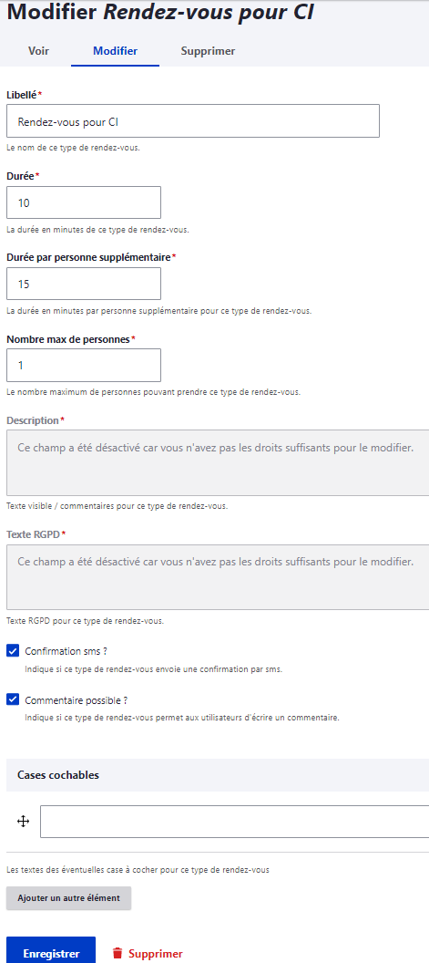 Après avoir cliqué sur le type de rendez-vous ou sur "Modifier", pour le supprimer, cliquez sur le bouton "Supprimer" en bas de la page. Un message d'alerte s'affiche et vous demande la confirmation de cette manipulation irréversible.