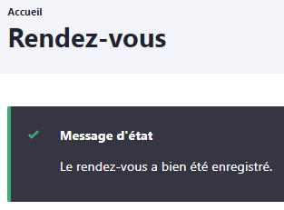 Après avoir cliqué sur le rendez-vous, vous pouvez modifier les champs renseignés et sauvegarder vos modifications en cliquant sur "Enregistrer". Un message d'état s'affiche.