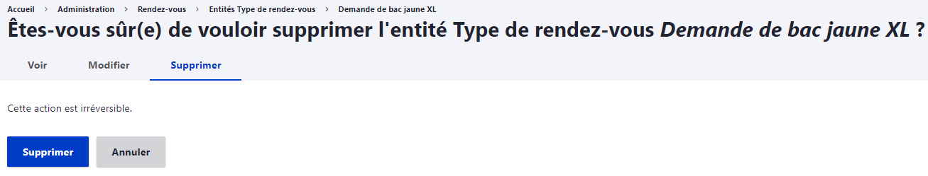 Pour confirmer la suppression définitive du type de rendez-vous, cliquez sur "Supprimer".