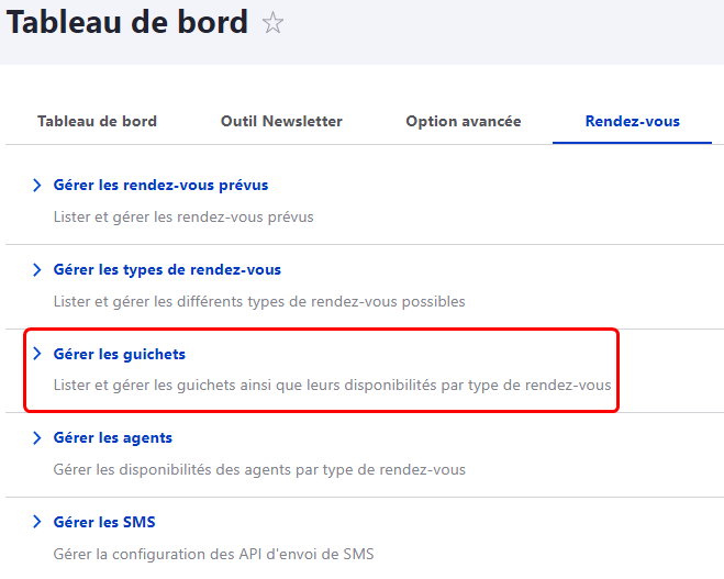 1. La seconde étape est de vous rendre sur le menu de guichets afin de configurer les différents guichets. Cliquez sur "Gérer les guichets" (aussi accessible depuis le planning des rendez-vous).