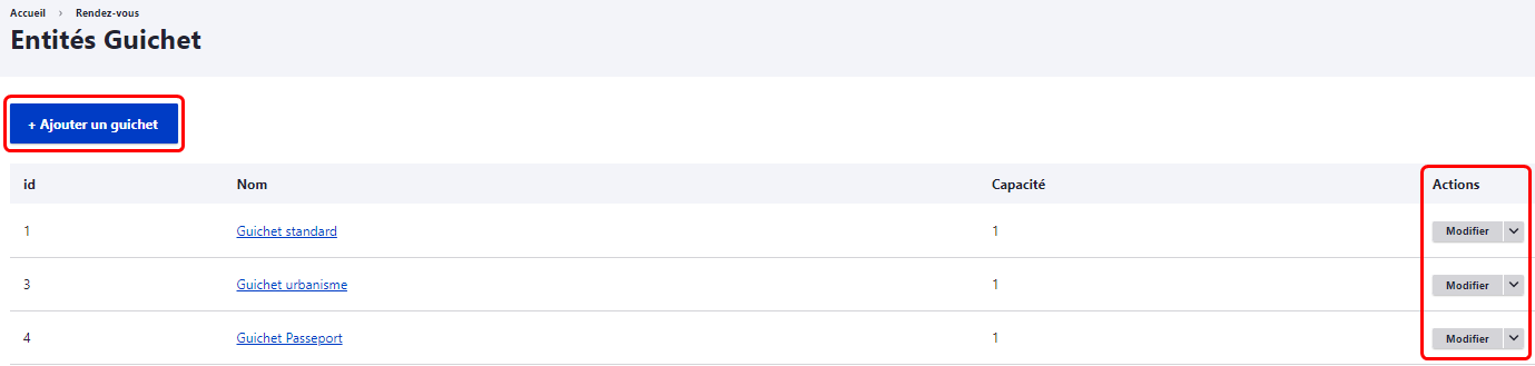 - Pour modifier ou supprimer un guichet, cliquez sur celui-ci ou sur "Modifier".