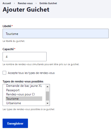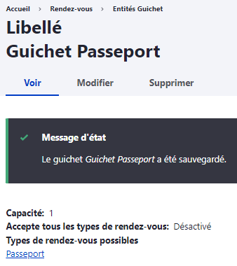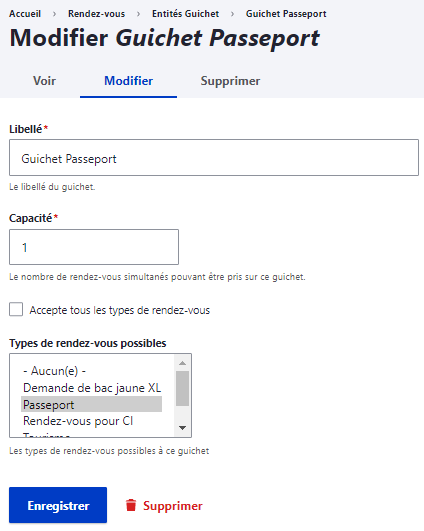 - Le champ "Capacité" correspond au nombre de rendez-vous pouvant être pris en même temps sur le même guichet.