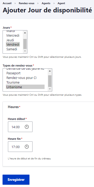 Accessible à l'agent uniquement pour ses propres disponibilités et l'administrateur