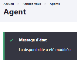 Après avoir cliqué sur la disponibilité, vous pouvez modifier les champs renseignés. Cliquez sur "Enregistrer" pour sauvegarder vos modifications. Un message d'état s'affiche.