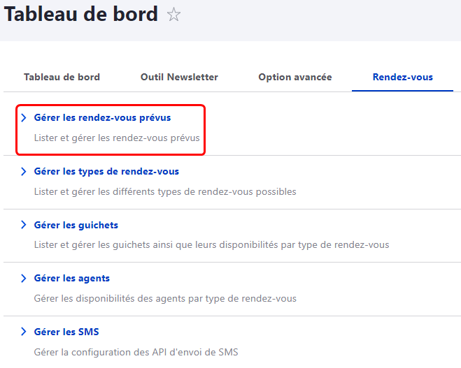 1. Le premier menu de la page d'accueil de l'onglet "Rendez-vous" vous propose de gérer les rendez-vous (rendez-vous pris par les citoyens et/ou les agents de la mairie et administrateurs du module). Cliquez sur "Gérer les rendez-vous prévus".