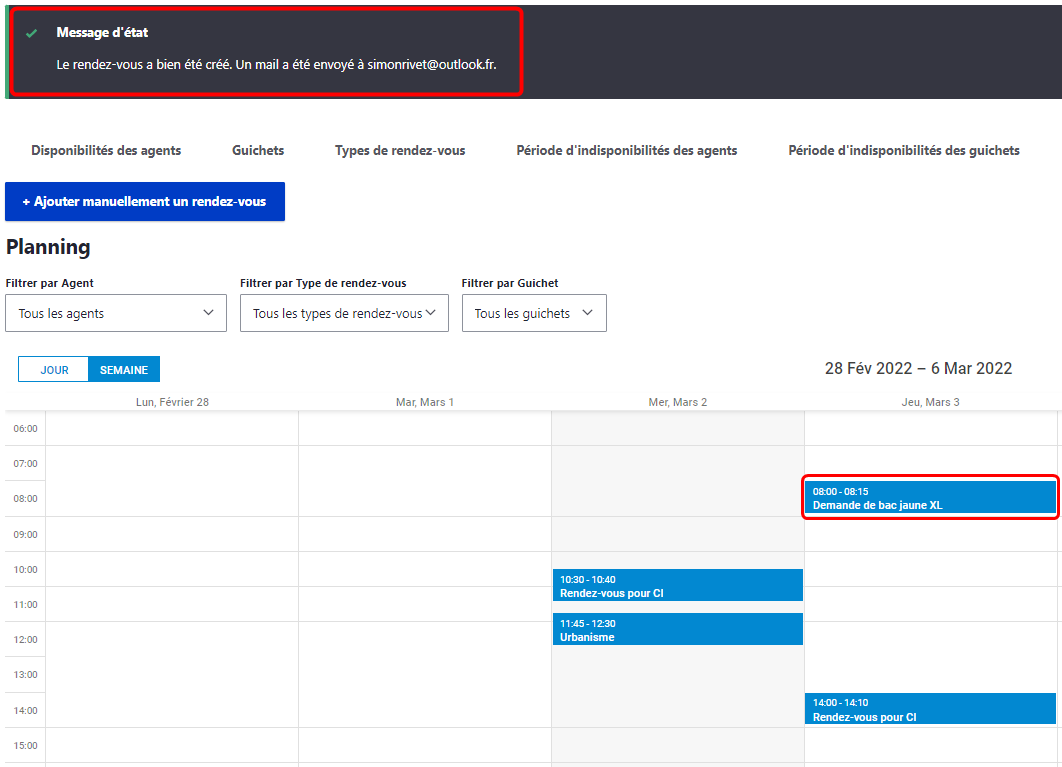 Après avoir cliqué sur le créneau souhaité ou sur "Ajouter manuellement un rendez-vous", vous renseignez les informations demandées dans le formulaire. Cliquez sur "Enregistrer" en bas de la page pour sauvegarder. Un message d'état s'affiche et le rendez-vous est ajouté au planning.