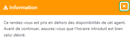 En BackOffice, vous avez également la possibilité de prendre un rendez-vous hors horaires. Dans ce cas, un message d'information s'affiche afin de s'assurer de la manipulation.