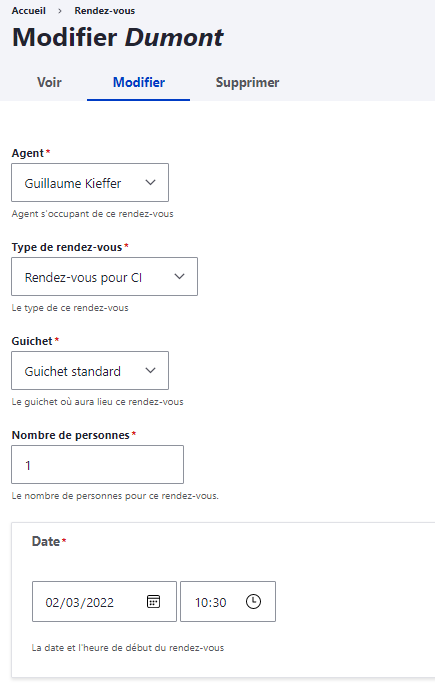 Après avoir cliqué sur le guichet ou sur "Modifier", vous pouvez modifier les champs renseignés.