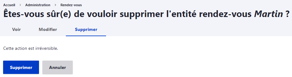 Après avoir cliqué sur le rendez-vous souhaité, pour le supprimer, cliquez sur le bouton "Supprimer" en bas de la page. Un message d'alerte s'affiche et vous demande la confirmation de cette manipulation irréversible.