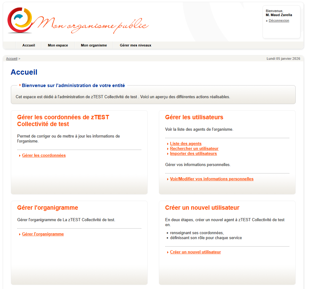 Avoir les accès administrateur de l’entité. Il s’agit du compte que vous avez donné pour la création de la collectivité lors de votre adhésion. Très souvent, il s’agit du mail de la mairie.
