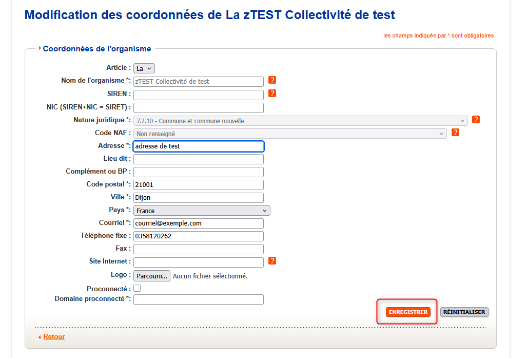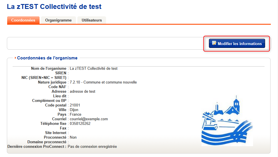 Ce module permet la mise à jour des informations de l'organisme, grâce au bouton "Modifier les informations" :