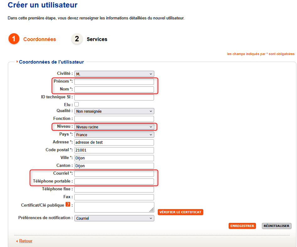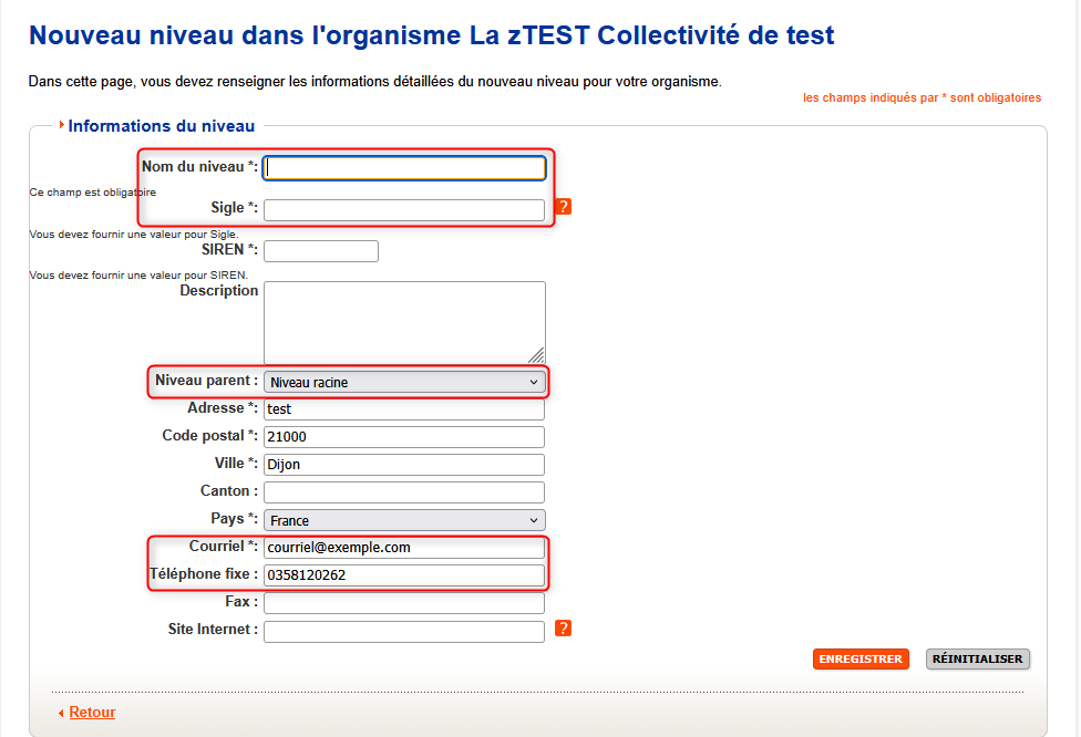 Les éléments à saisir sont le nom du niveau, le sigle, le niveau parent, le courriel et le téléphone fixe. Ces éléments sont nécessaires pour faciliter la communication directe avec le bon service.
