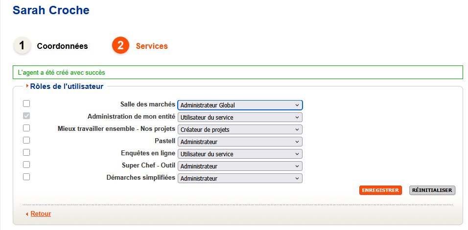 Une fois ces éléments saisis, cliquer sur Enregistrer pour passer à l'étape suivante : celle des services auxquels l'utilisateur doit avoir accès :