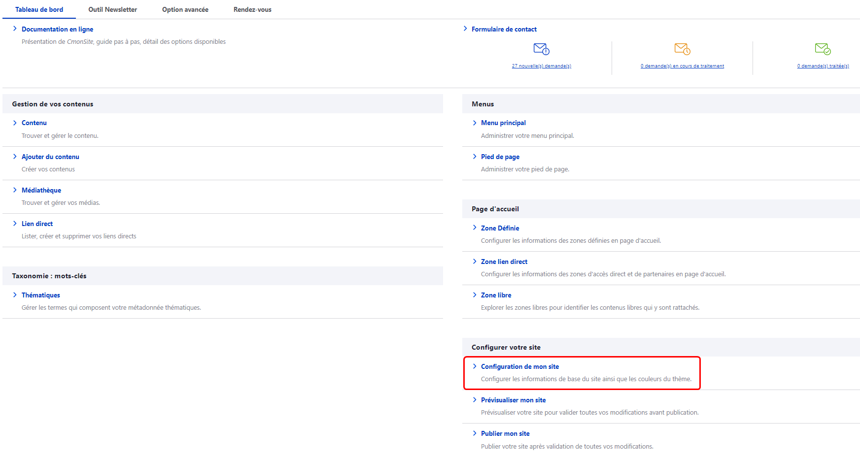 Afin de configurer les informations de base du site, cliquez sur "Configuration de mon site".