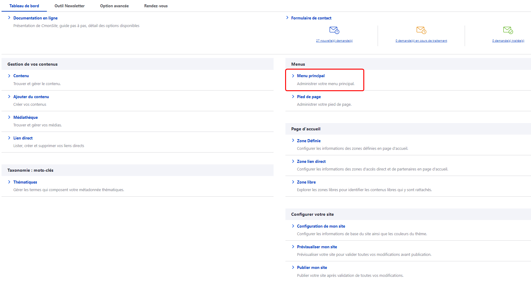 4. Retournez sur le tableau de bord afin de terminer le paramétrage. Cliquez sur « Menu principal"